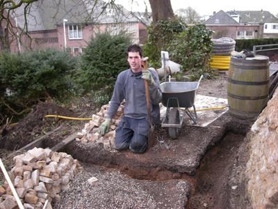 Om de bovenste laag van de molenvoet fundatie te ontlasten van overmatig hemelwater, hebben wij rond de molenvoet een drainage systeem aangelegd. Met behulp van t - stuk aansluitingen wordt het hemelwater nu molenberg afwaarts gedraineerd. Vervolgens hebben we de drainagegoot gevuld met grind.