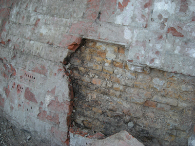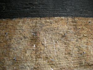 | geval voorzien van een cementpleister, vervolgens werd deze pleister voorzien van koolteer. Opgezogen grondwater kon hierdoor niet meer via de buitenkant uittreden. |