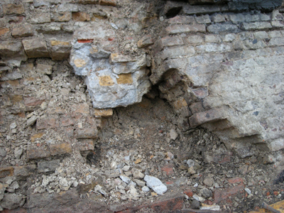 Op maaiveldniveau is het metselwerk nu voorzien van een rollaag bestaande uit IJsselsteentjes, met als doel de kalkpleisterlaag minder kwetsbaar te maken voor optrekkend en opspattend vocht.